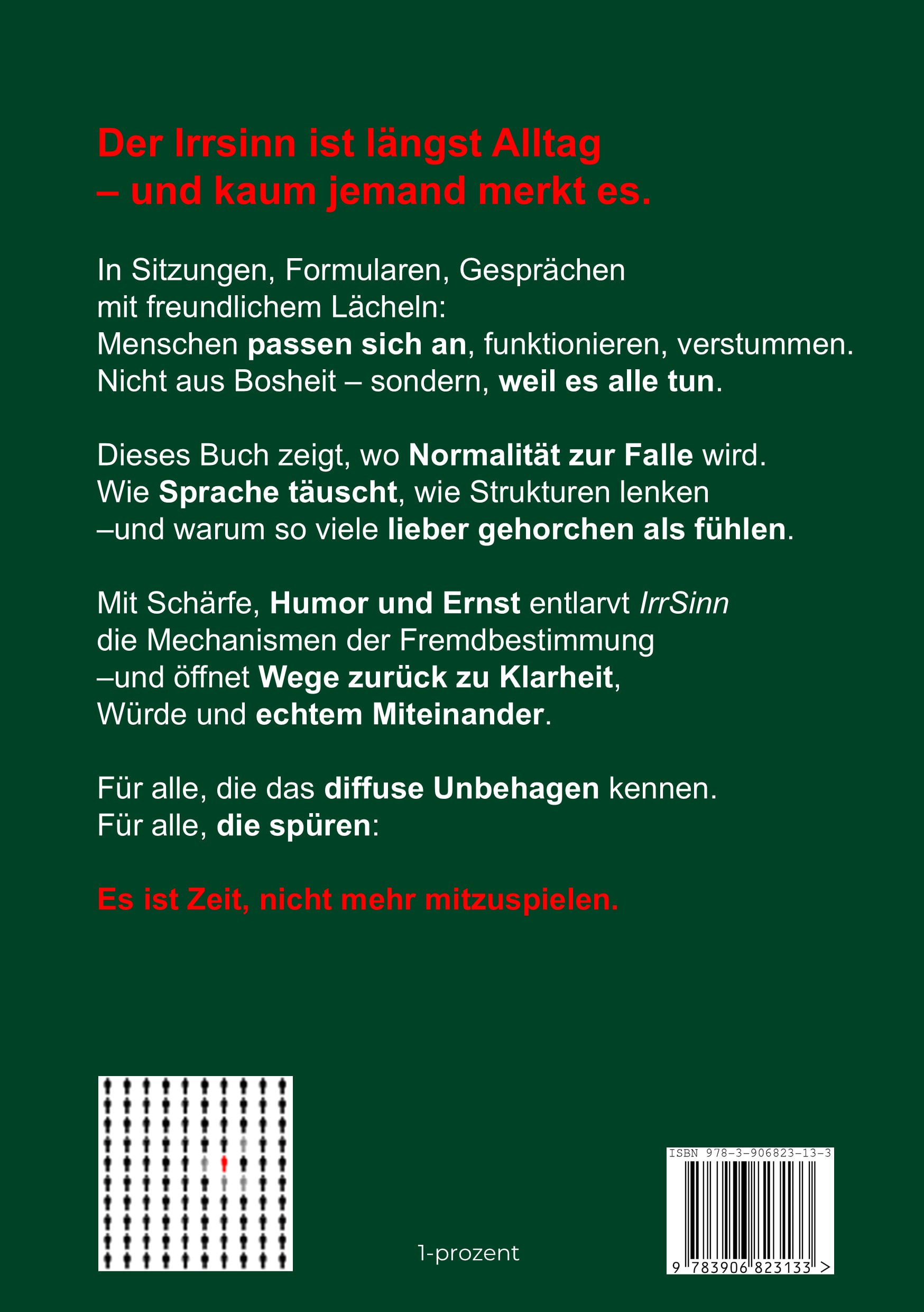 In Sitzungen, Formularen, Gesprächen mit freundlichem Lächeln: Menschen passen sich an, funktionieren, verstummen. Nicht aus Bosheit – sondern weil es alle tun. Dieses Buch zeigt, wo Normalität zur Falle wird. Wie Sprache täuscht, wie Strukturen lenken – und warum so viele lieber gehorchen, statt zu fühlen. Mit Schärfe, Humor und Ernst entlarvt IrrSinn die Mechanismen der Fremdbestimmung – und öffnet Wege zurück zu Klarheit, Würde und echtem Miteinander. Für alle, die das diffuse Unbehagen kennen. Für alle, die spüren: Es ist Zeit, nicht mehr mitzuspielen.